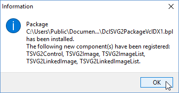 After installation there will be a notification that four new components have been registered: TSVG2Control, TSVG2Image, TSVG2ImageList and TSVG2LinkedImage.
